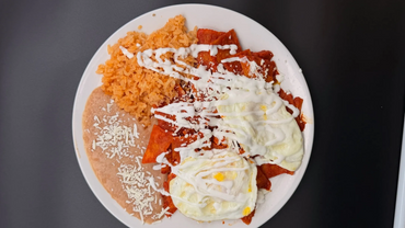 TORTILLAS DE MAIZ CORTADO EN TROSOSY DORADAS CON SALSA ROJA, ACOMPANADO CON FRIJOLES REFRITOS Y ARROZUN HUEVO COCINADO AL GUSTO Y UNA RICA CREMA ENCIMA